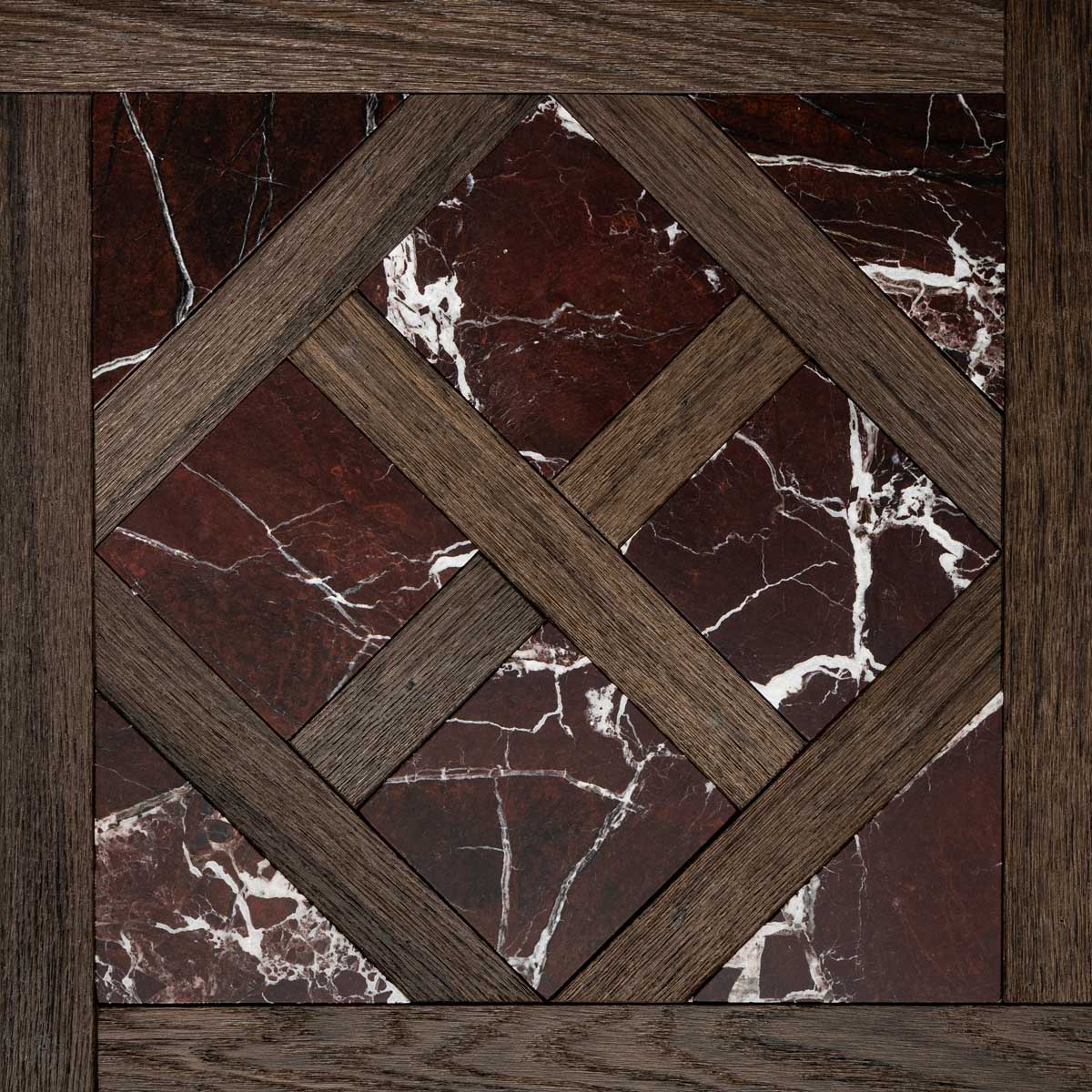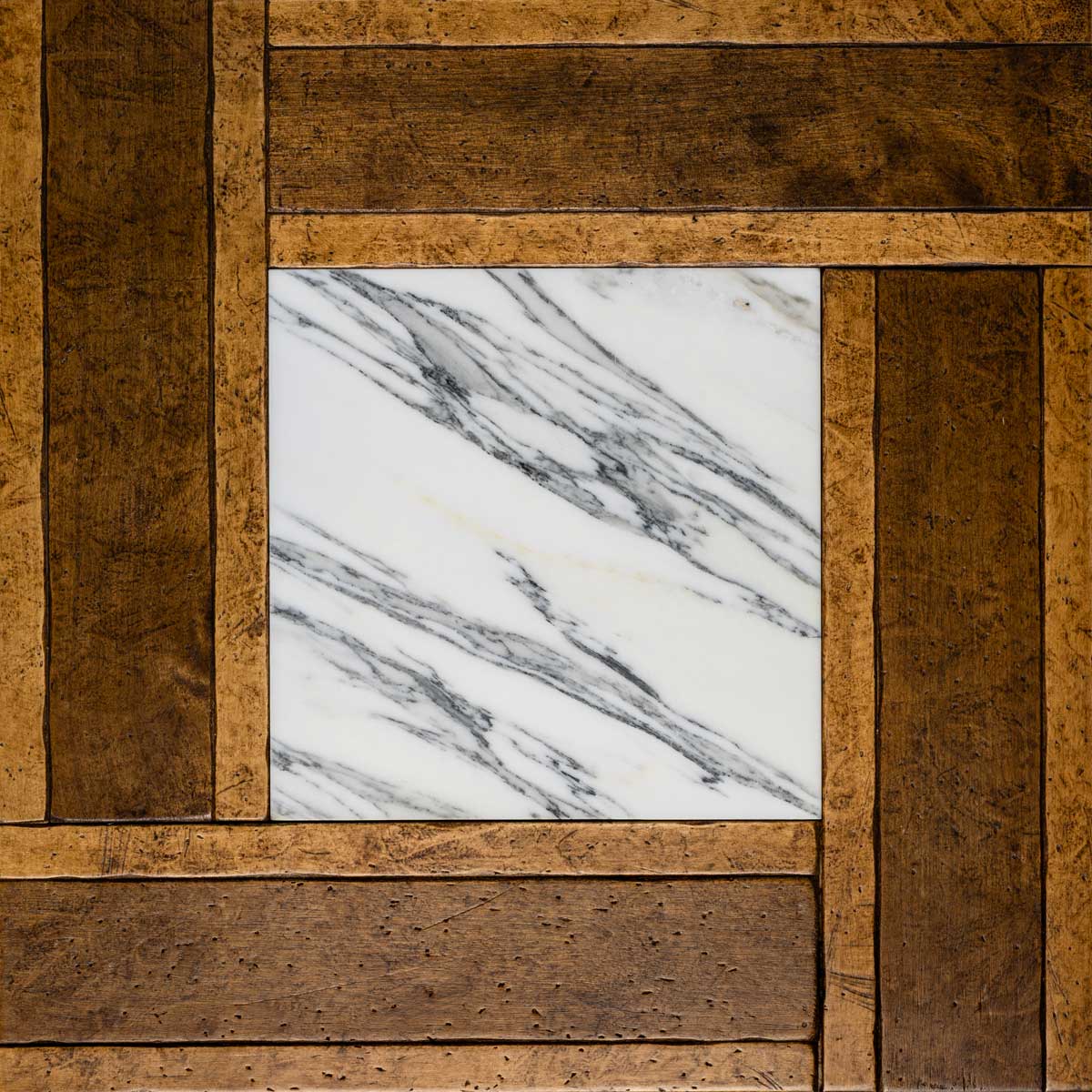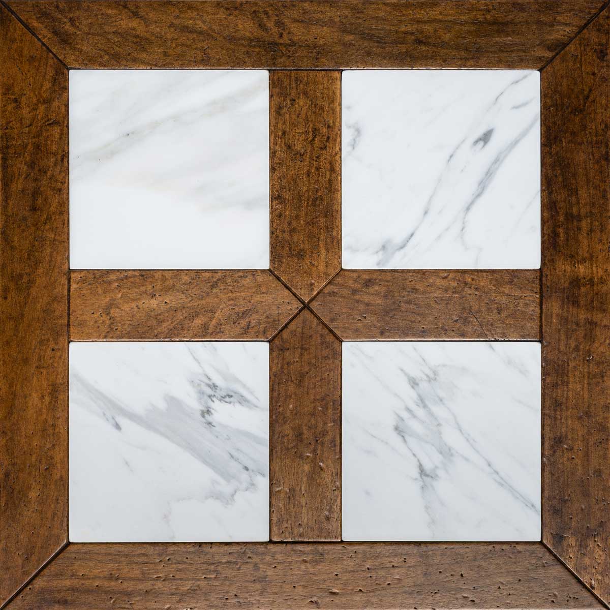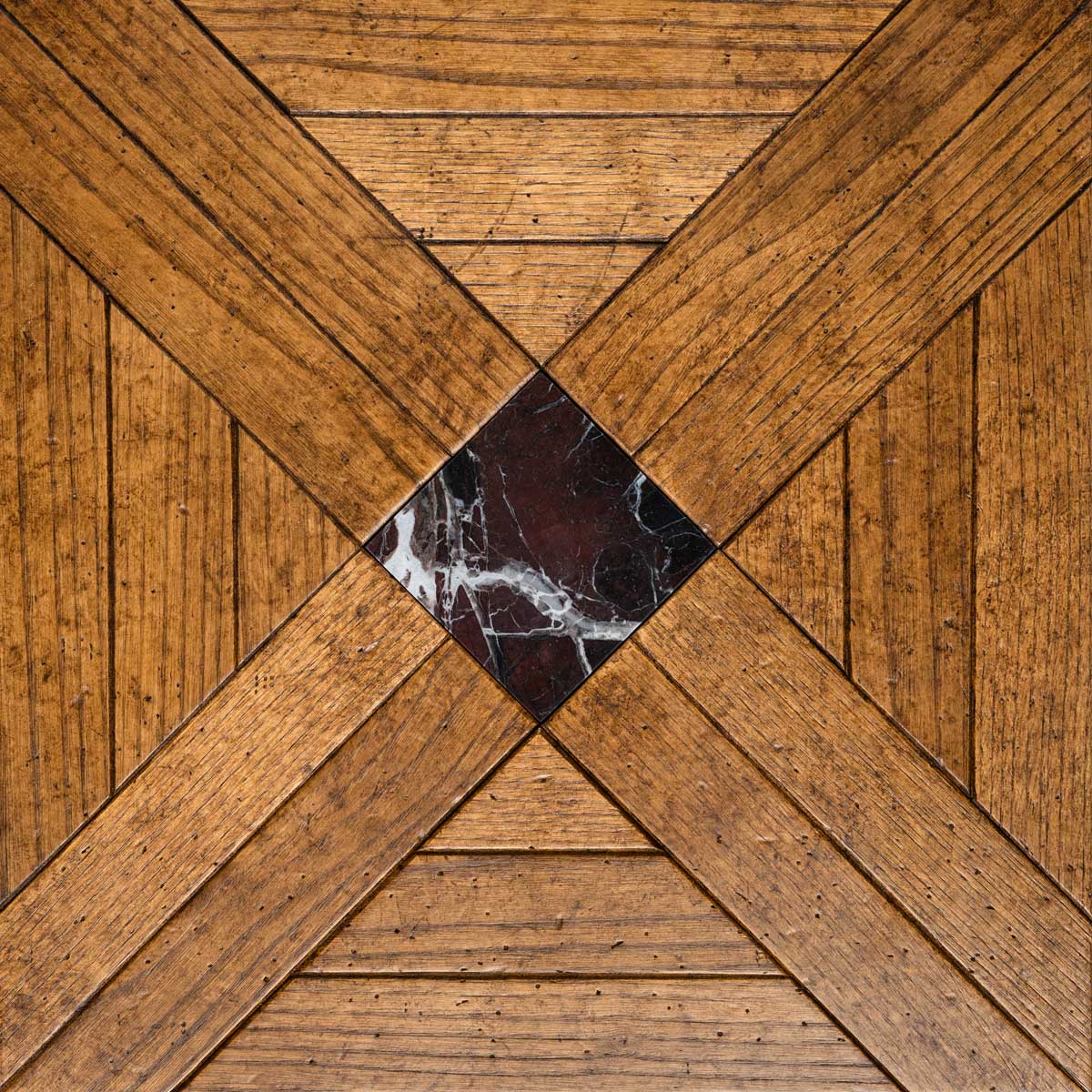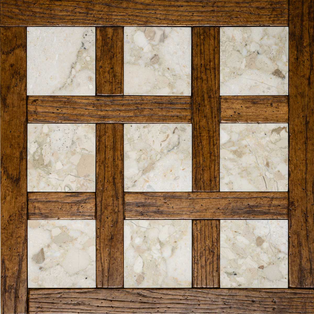 Each tile is made from fine woods such as oak, cherry, chestnut, maple, and ash, handcrafted to achieve an antique, patinated effect that evokes the charm of historic residences. Natural stone is incorporated into the design like a jewel: inlays in Breccia Veneziana, Rosso Lepanto, Verde Alpi, Bianco Carrara, and Calacatta create classic patterns that catch the eye. The protective finish of beeswax and natural oil guarantees extreme beauty and a pleasant feel that invites you to enjoy the space.