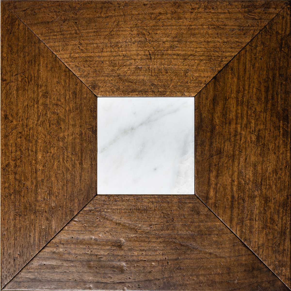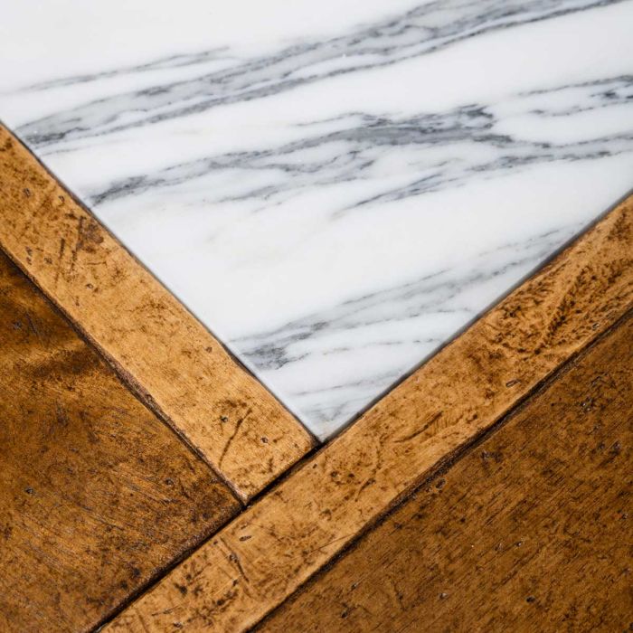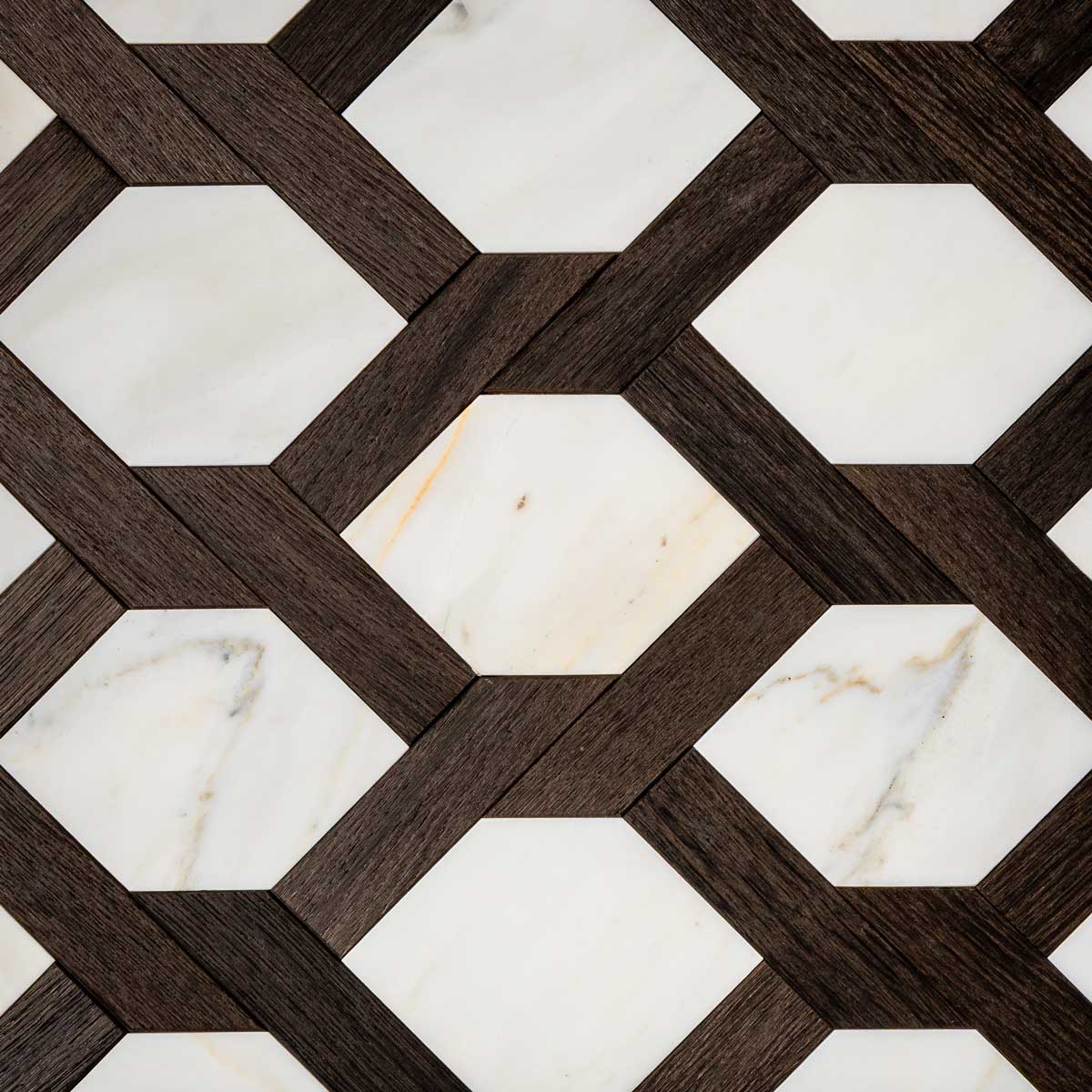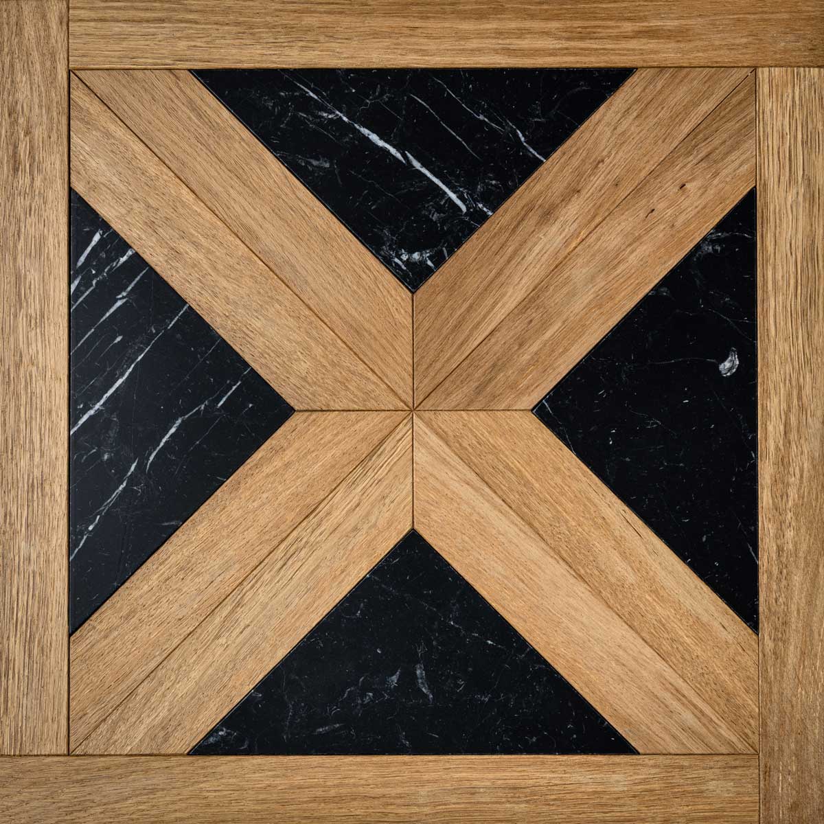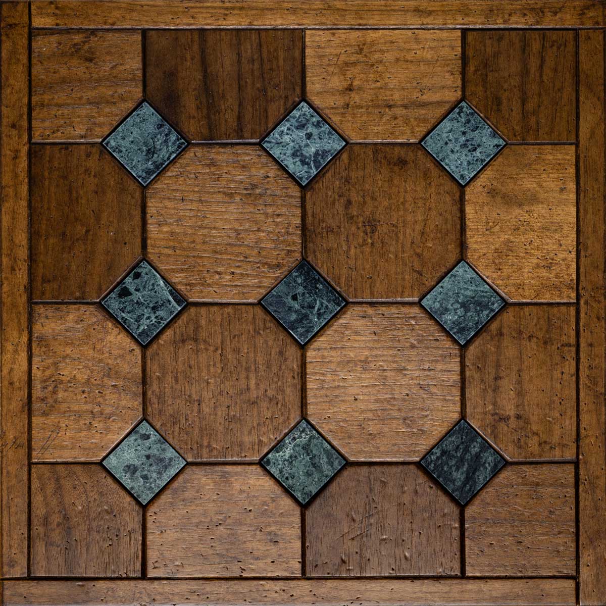 Each tile is made from fine woods such as oak, cherry, chestnut, maple, and ash, handcrafted to achieve an antique, patinated effect that evokes the charm of historic residences. Natural stone is incorporated into the design like a jewel: inlays in Breccia Veneziana, Rosso Lepanto, Verde Alpi, Bianco Carrara, and Calacatta create classic patterns that catch the eye. The protective finish of beeswax and natural oil guarantees extreme beauty and a pleasant feel that invites you to enjoy the space.