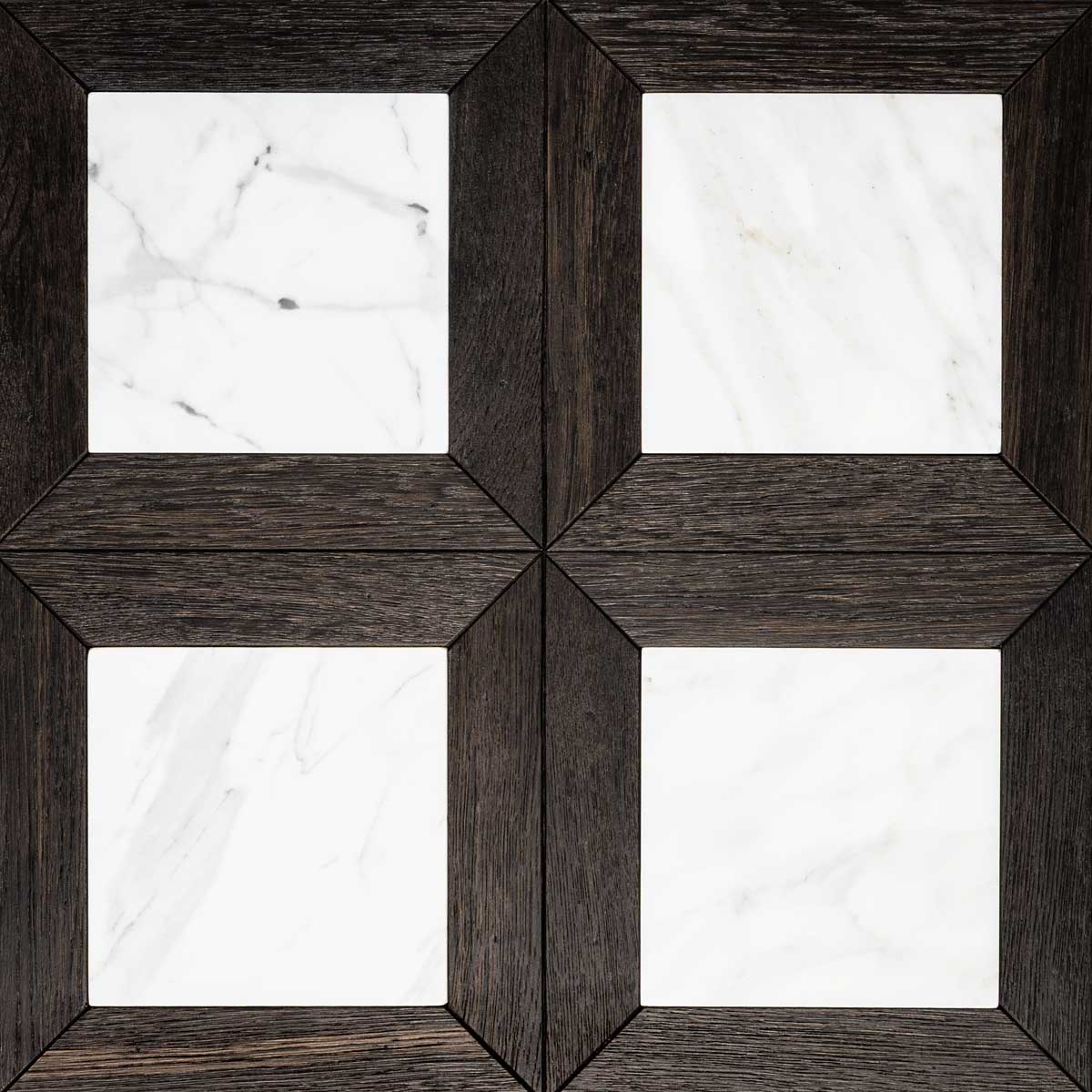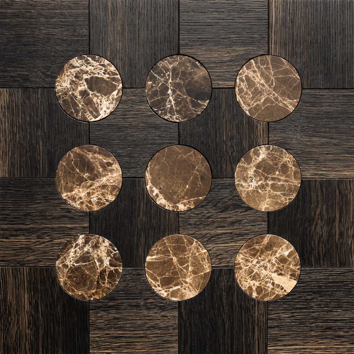 Domos combines this living material with the nobility of Italian marble: geometric inlays in Calacatta Oro, Rosso Lepanto, Bianco Carrara, Nero Marquinia, and Emperador Dark blend with fossil wood such as oak, ash, and elm. The result is a contemporary, technically flawless surface (high-quality birch plywood support), ready to be installed in the most exclusive settings. It is the ideal choice for those seeking authentic, material, and sustainable luxury.