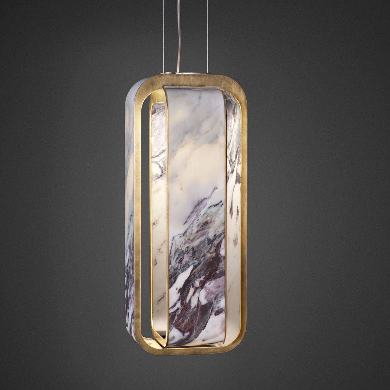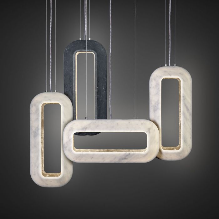 Disponibile in versione da tavolo o a sospensione, è realizzata in quattro formati e diverse combinazioni materiche Onice Bianco, Verde o Dusk, Bianco Calacatta, Breccia Capraia, con dettagli in ottone, seta e acciaio lucido.