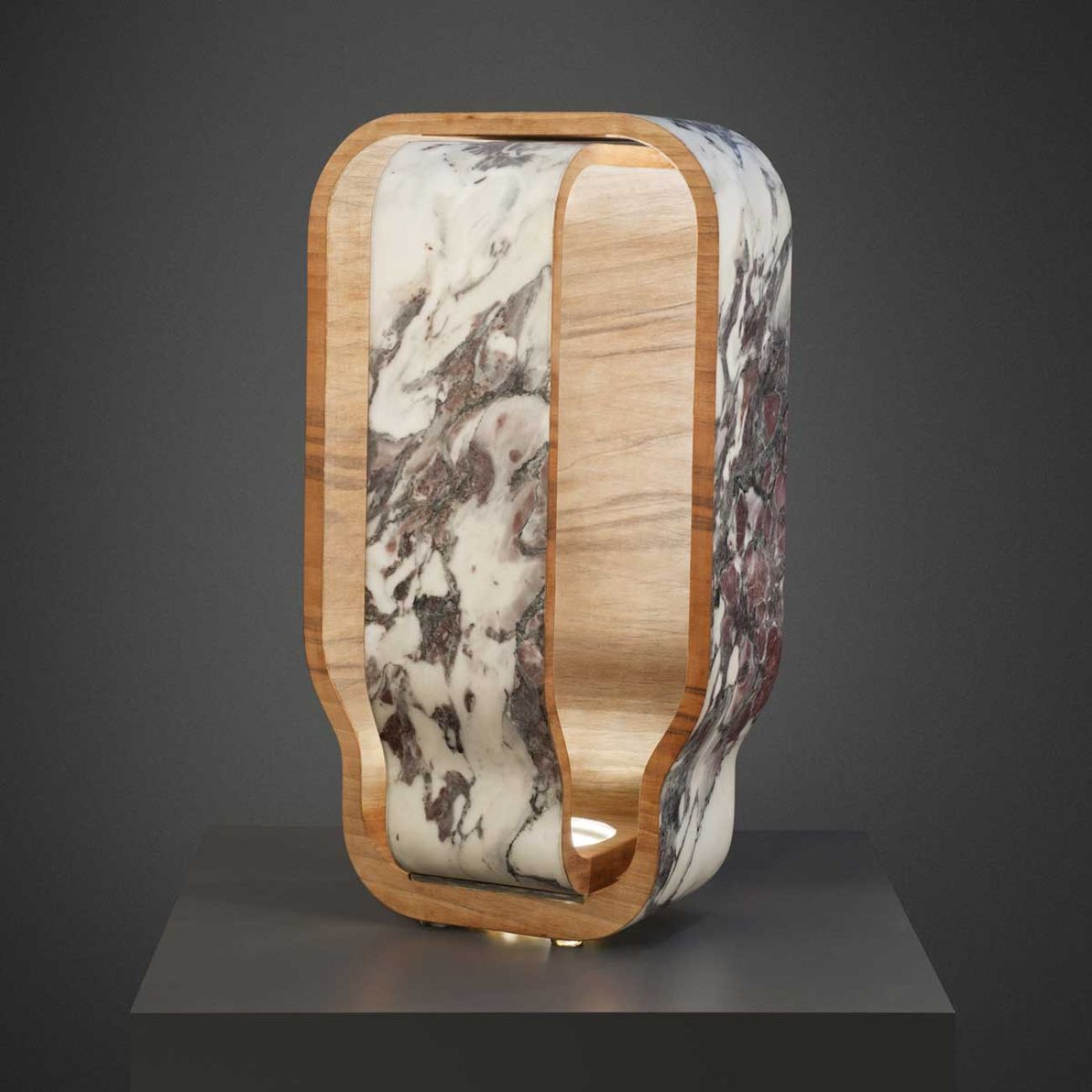 Nata da un unico blocco di marmo, Paolo&Francesca è una lampada da tavolo che racconta l’intimità di un legame indissolubile. Le curve morbide e il contrasto tra i materiali rendono omaggio all’unione tra due amanti, dove marmo e legno si intrecciano in un abbraccio che custodisce e diffonde la luce.